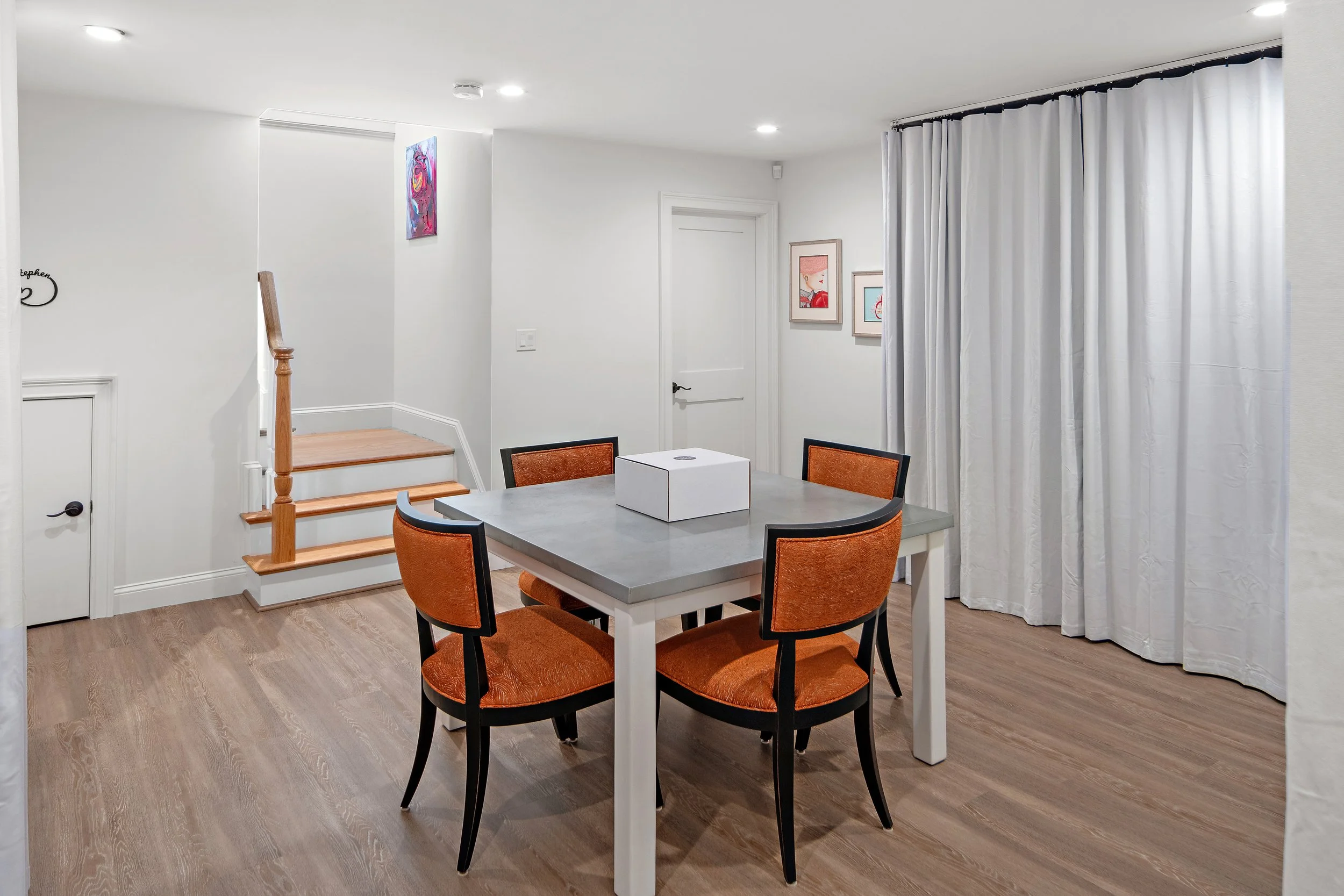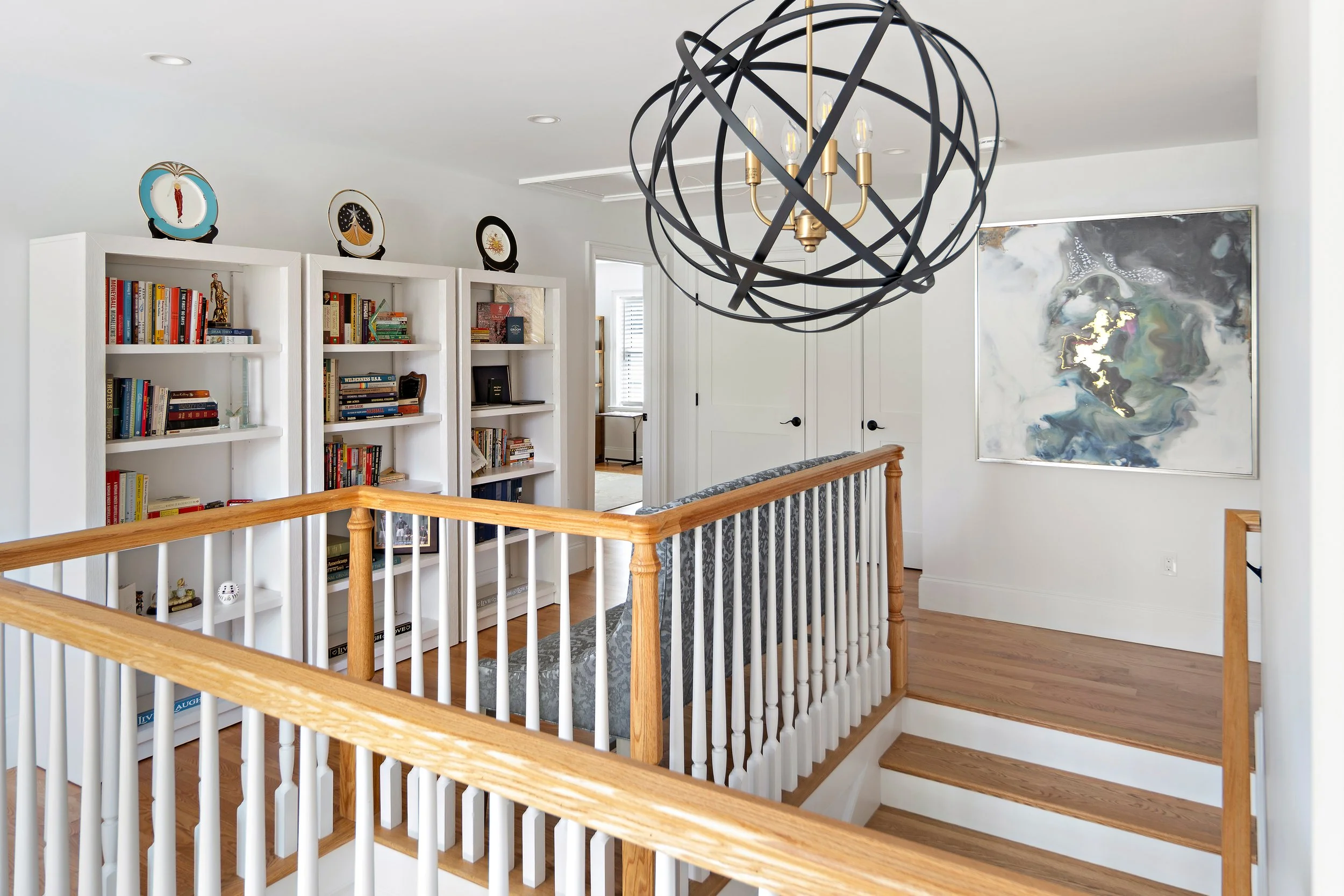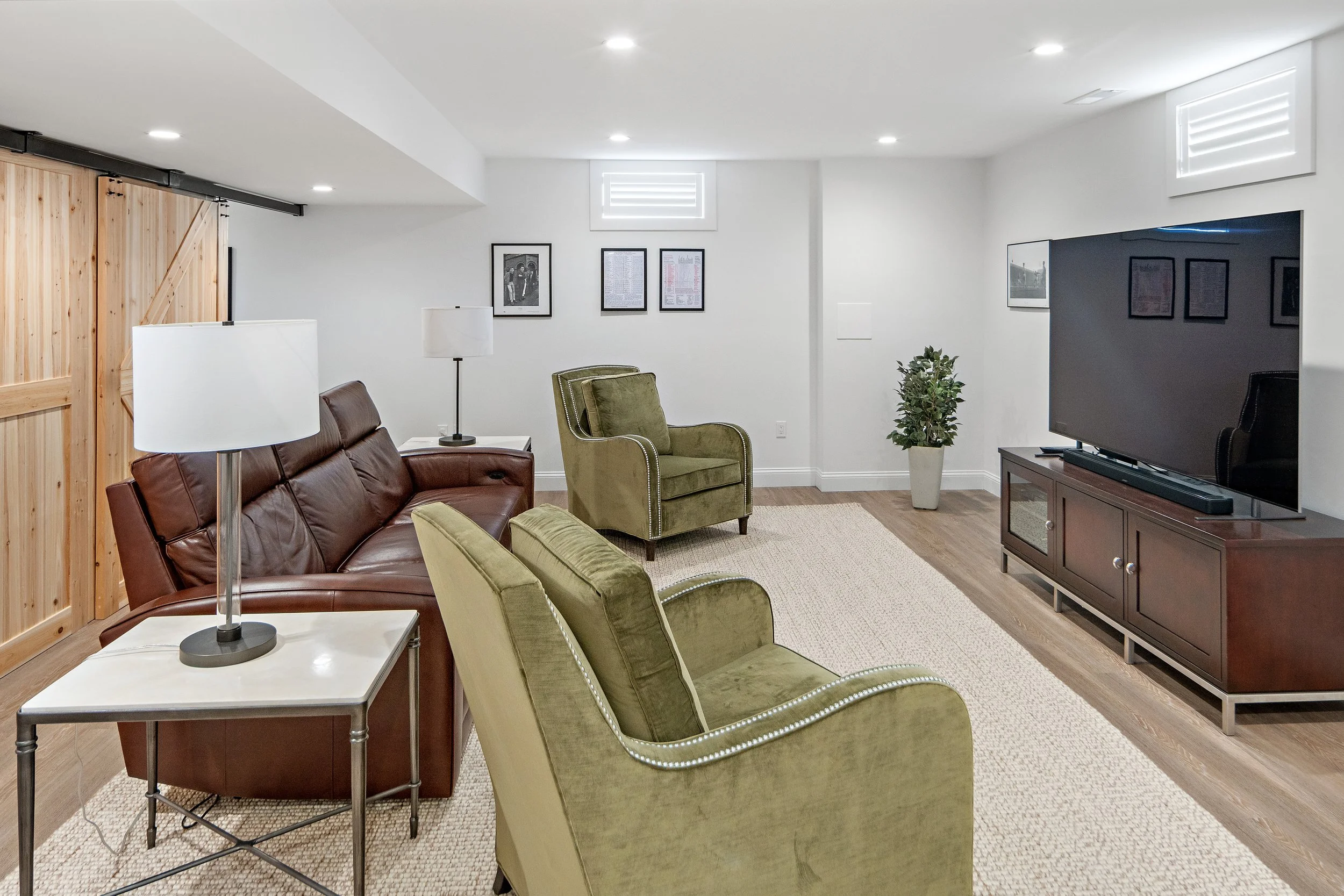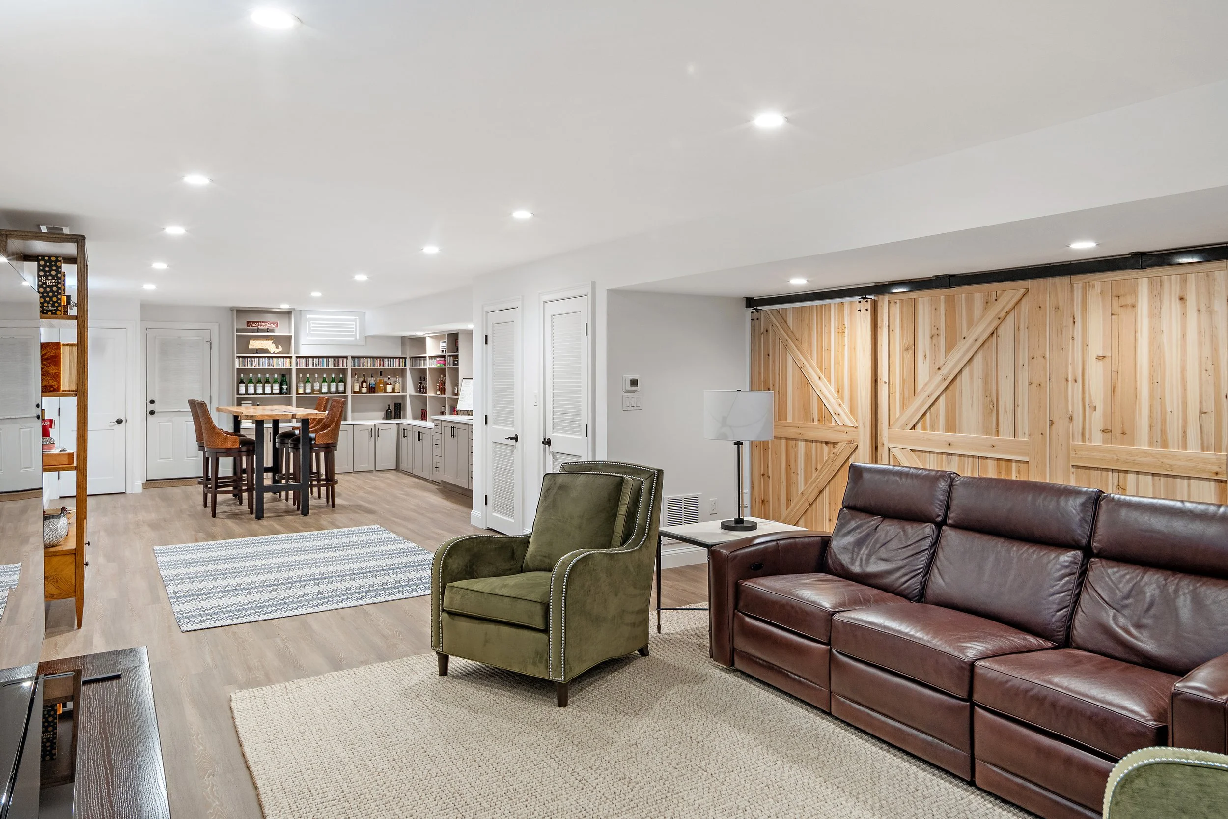 This is a love story of two people who have come together each with their own cultures, travel experiences, history and style. He in his converse sneakers, her in her high heals. Their personal art collections compliment the new furniture they selected to start their lives together. Or I might say, the new furniture complimented their personal art collections. When designing the wide open finished basement, we opted for barn doors in an unconventional application to divide the space. The barn doors reminded her of her childhood, every detail in this house is part of their story.