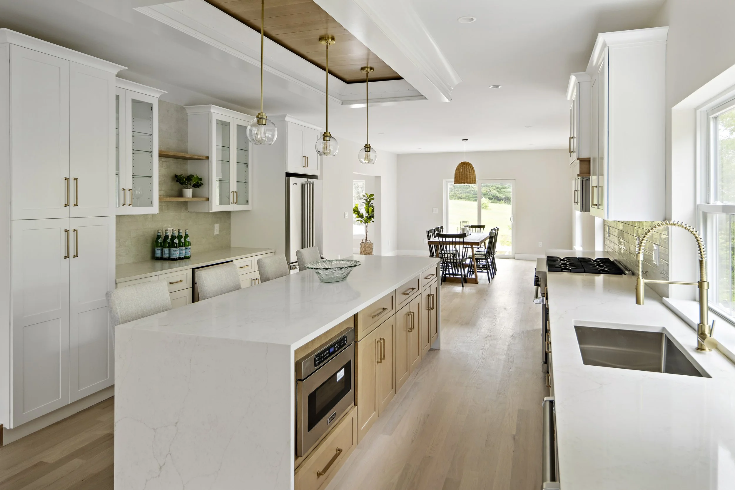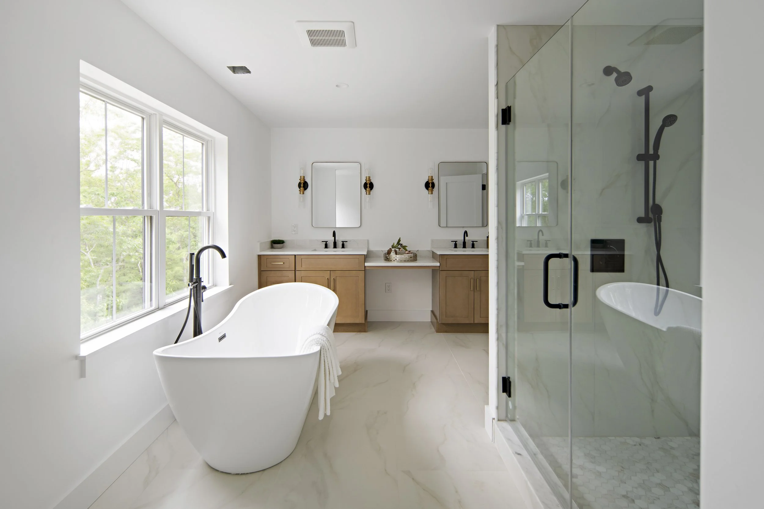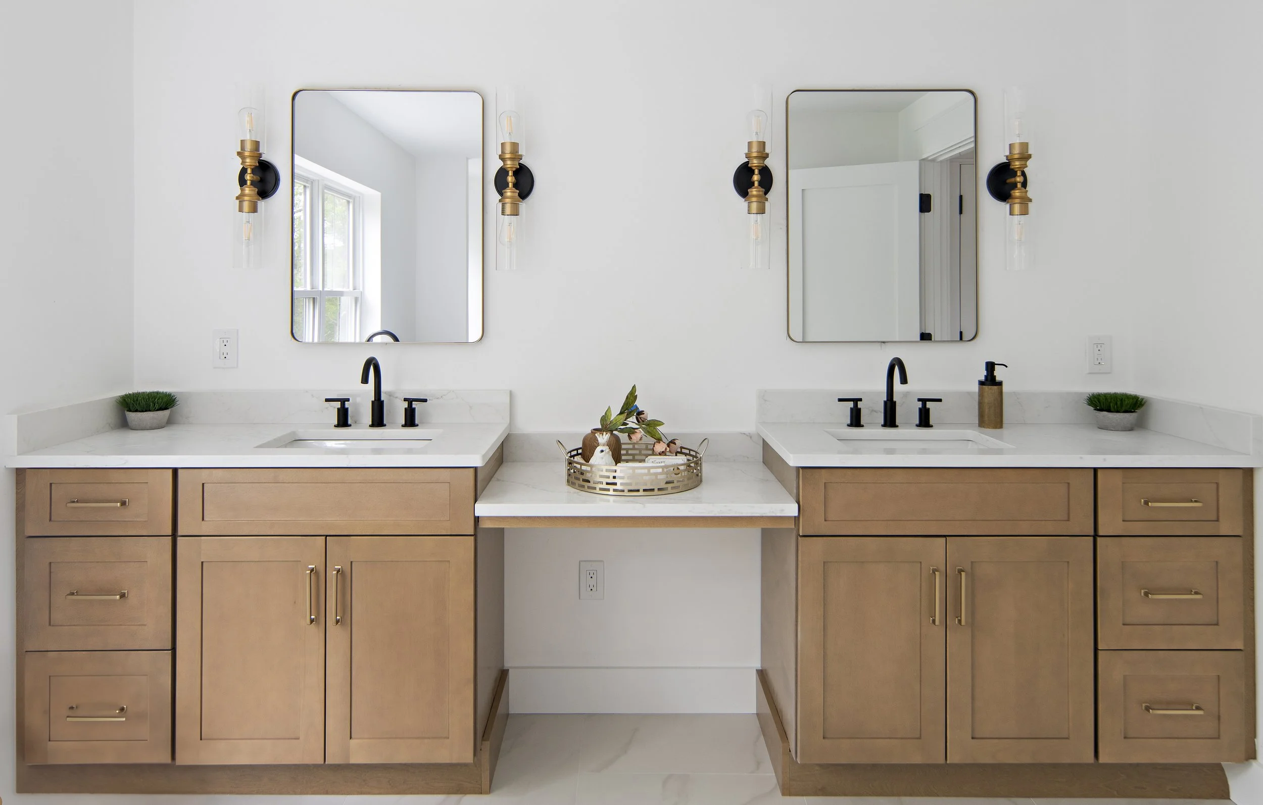 Designing and staging the interiors of this “spec” house was refreshing, I was able to work with a builder who was open to new idea’s. This house is far from a typical builder house. This house is truly transitional, prospective homeowners were drawn in whether they were looking for a traditional or a contemporary home. The general scheme is warm woods, with soft brass hardware, black accents with clean lines. As an Interior Designer, selecting finishes for new construction means being a few steps ahead of the latest trends.