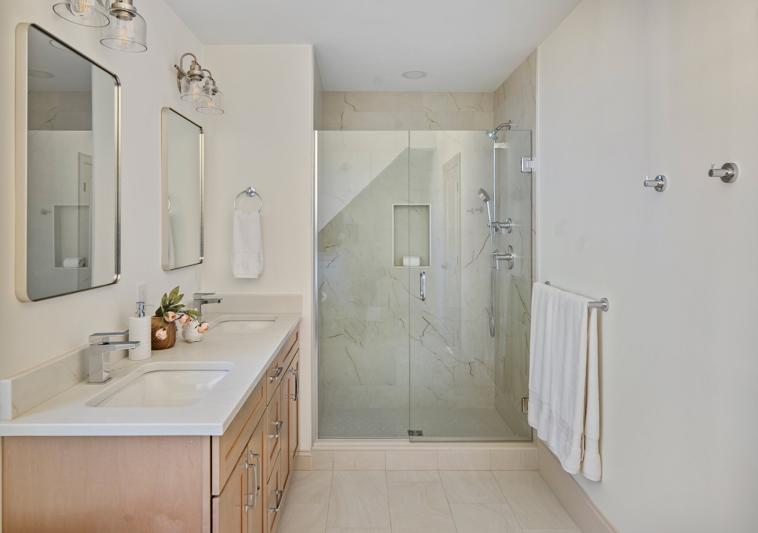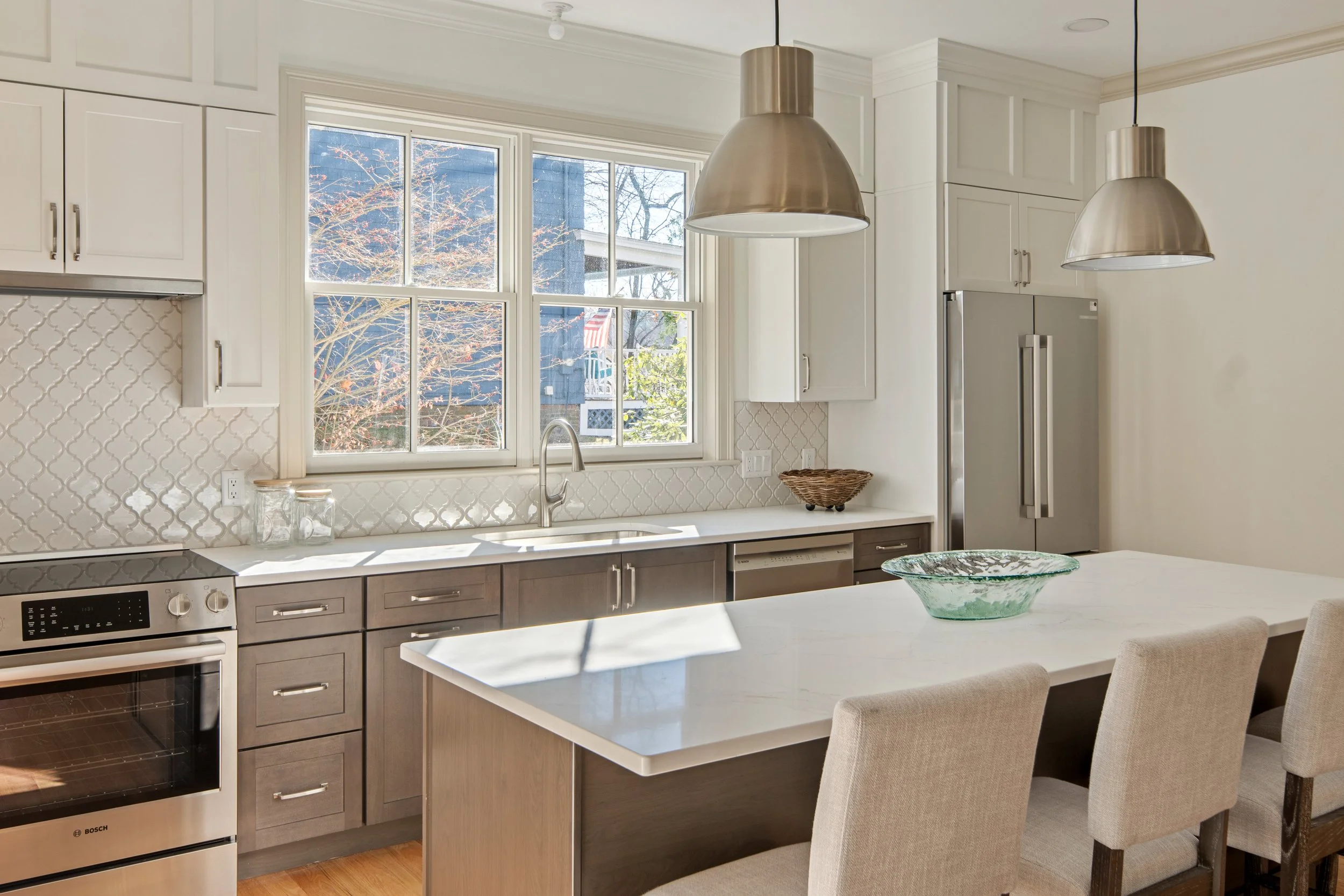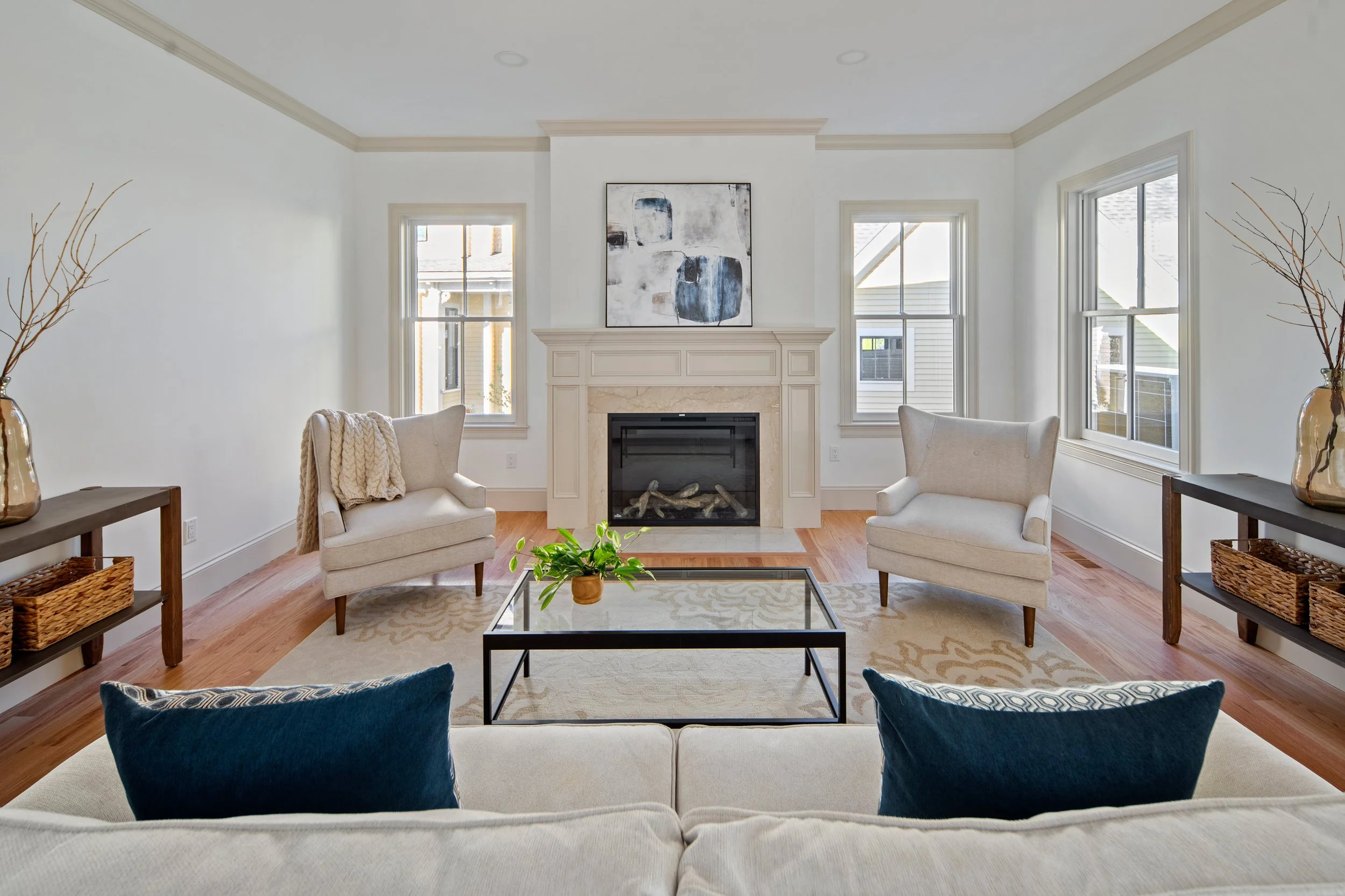 This unique assignment was to create an interior that was both true to its historical architecture yet appeal to modern lifestyles. The original house that was on this property was historical, the builder complied to the strict historical guidelines on the exterior however, the interior was mine to design. I immediately knew the walls and trim could not be painted white. I chose a soft off white for the wall and the same color on the rim only a few shades darker. I discussed taking this chance with building on a spec house, that made all the difference.